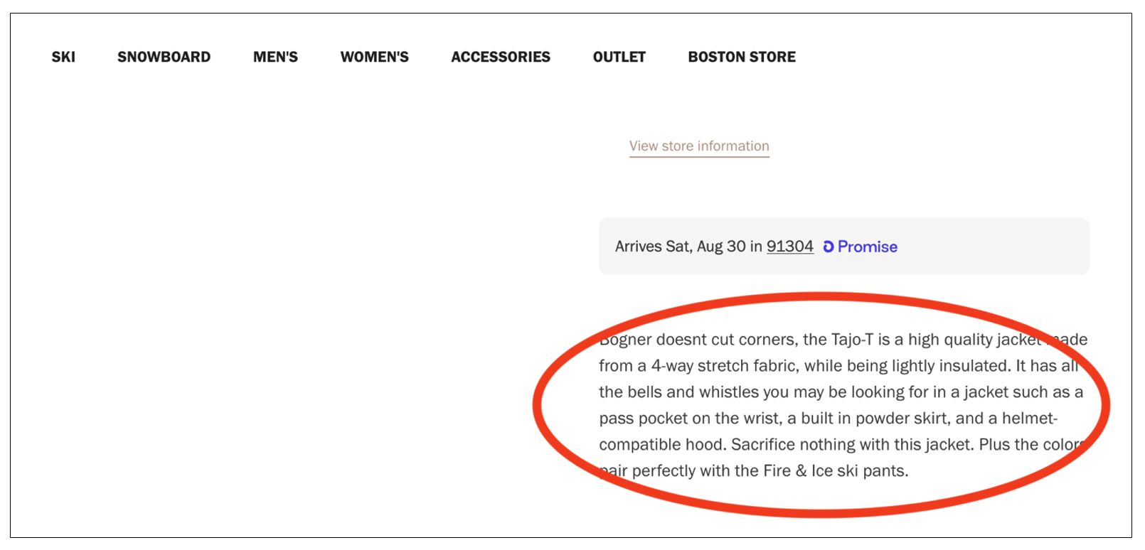 Google likes sites with keywords in actual searches like "womens snow jacket red" or "snow jackets near me." Google likes text organized in optimized sentences (because that's how human beings read).